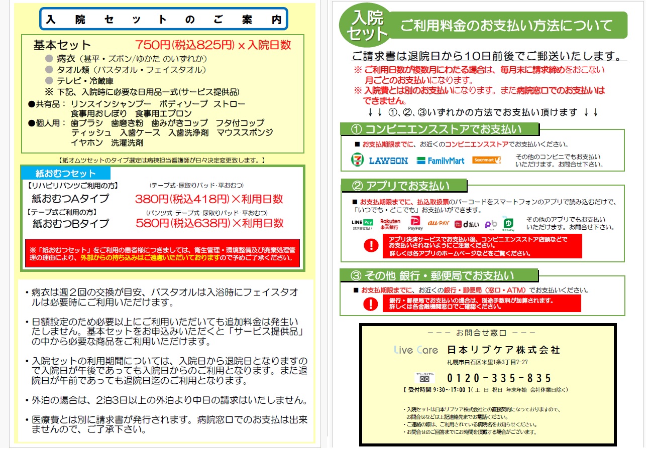 当院では、院内の衛生管理・感染予防及び環境整理また、患者者様及びご家族様サービス向上と労力負担(入院中の洗濯や日用品の補充)の軽減の観点から、2026年3月1日から「入院セットサービス」を導入致します。 「入院セットサービス」は、入院時に必要なタオル・お寝巻き、消耗品・紙おむつ等を日額定額でご利用いただけるサービスで、ご利用期間中は、タオル・お寝巻きの洗濯や、消耗品・紙おむつの購入が不要になります。 又、テレビ・冷蔵庫も自由にお使い頂けます。 なお、入院セットサービスの導入に伴い、これまで行っておりました病衣の貸し出しは2026年2月末日をもって終了致します。 【お申込方法】 委託指定業者:日本リブケア株式会社 ※委託指定業者と患者様(ご家族様)との直接契約となります。 導入開始時期:2026年3月1日 申込方法:利用申込書を入院セット受付窓口にご提出下さい。 お問い合わせ先:0120-102-606 受付時間:平日9:30~17:00(土・日・祝日は休み) 【お支払方法】 ご利用料金はご使用の有無に関わらず、日額料金となります。 委託指定業者から請求書兼払込票を郵送致しますので。コンビニエンスストア等にてお支払い下さい。 ※当院の入院費とは別のお支払いとなりますのでご注意ください。